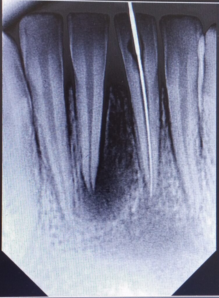 To assess the extent of the injury, we employed periapical X-rays, revealing radiolucency around the affected teeth. This indicated potential damage to the dental pulp and surrounding tissues, necessitating a strategic treatment plan.